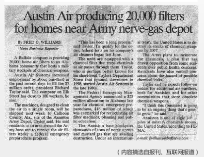 2001年,9.11事件后,美國聯(lián)邦應(yīng)急管理局(FEMA)、美國國土安全部(DHS)、美國紅十字會(huì)等機(jī)構(gòu),均針對室內(nèi)空氣環(huán)境提出了全新標(biāo)準(zhǔn),并一致推薦奧司汀產(chǎn)品,稱其為最值得信賴的空氣凈化器! 同年,美國紐約政府采購?qiáng)W司汀空氣凈化器20,000臺(tái),用于Alibama州的Anniston軍事基地周邊村民的健康保障工作。